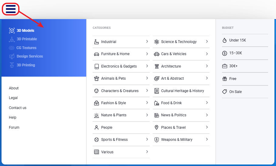 To find the required asset, use the READY 3D® search bar located at the top of the website.