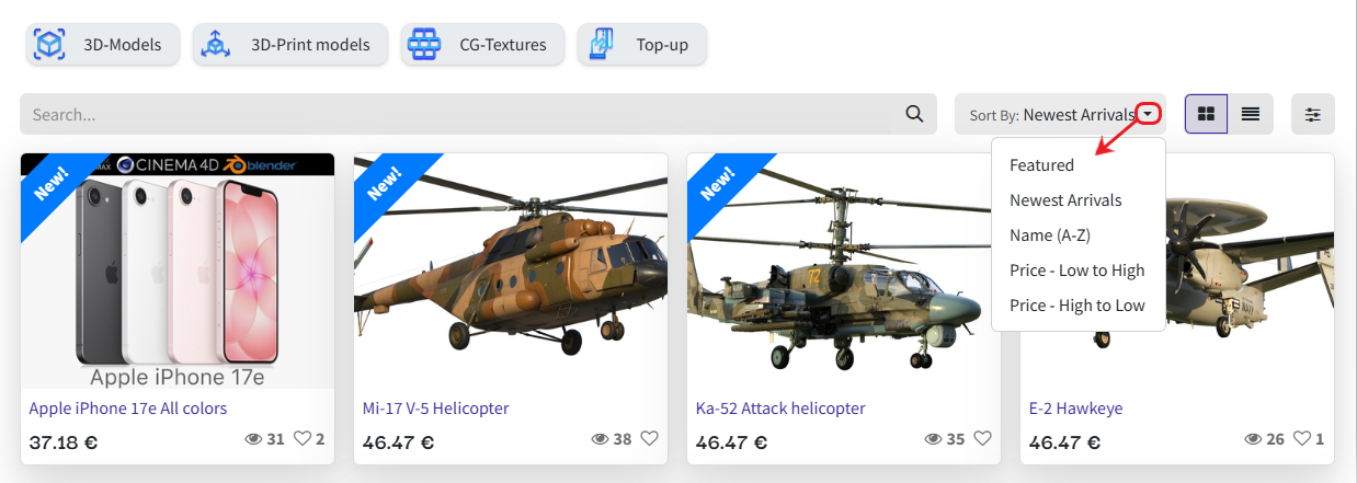 After entering the catalog or performing a search, you can refine results using available filters. READY 3D offers two types of filtering: